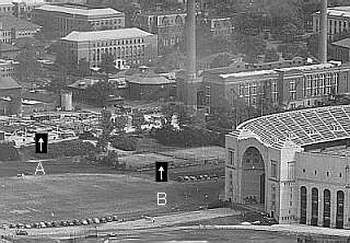 Jesse Owens may have meant to say "All American Grove". The grove was reserved for All American football players, although other famous trees had been planted near the grove. This area was located south of the varsity tennis courts (B) as seen in this 1947 photograph. Several construction projects (A) may have involved relocating some of the trees from the surrounding area. Eventually, the entire area was replaced by parking lots.